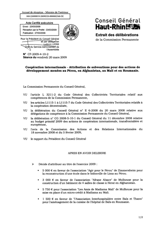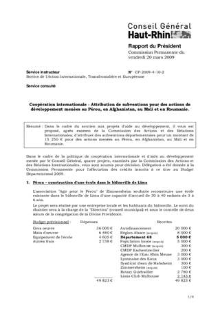 Coopération internationale - Attribution de subventions pour des actions de développement menées au Pérou, en Afghanistan, au Mali et en Roumanie.