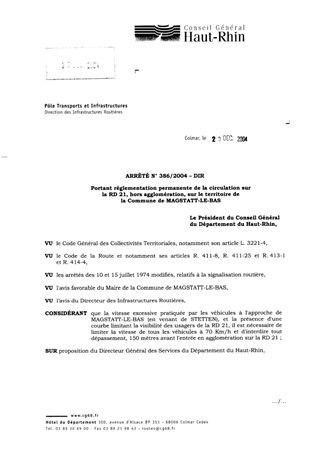 portant réglementation permanente de la circulation sur la RD 21, hors agglomération, sur le territoire de la commune de Magstatt -le -Bas. Resumé Pièces jointes ARRETE Assemblée : Non défini Date : 23/12/2004 Rapporteur : Non défini Collectivité : Conseil départemental du Haut-Rhin Direction : Non défini Service : Direction des Routes Domaine : Circulation Commission :