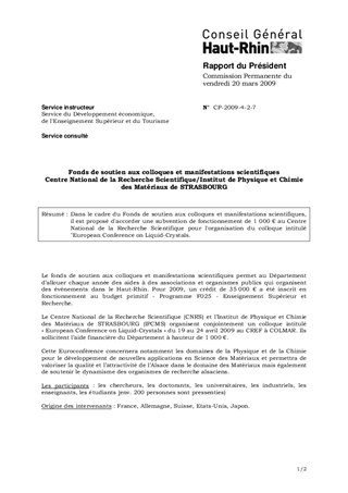 Dans le cadre du Fonds de soutien aux colloques et manifestations scientifiques, il est proposé d'accorder une subvention de fonctionnement de 1 000 € au Centre National de la Recherche Scientifique pour l'organisation du colloque intitulé "European Conference on Liquid-Crystals.