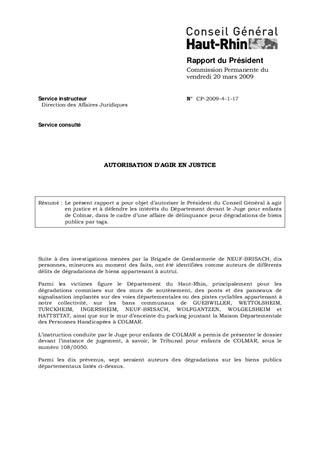 Le présent rapport a pour objet d’autoriser le Président du Conseil Général à agir en justice et à défendre les intérêts du Département devant le Juge pour enfants, dans le cadre d’une affaire de délinquance pour dégradations de biens publics par tags, concernant plusieurs auteurs présumés.