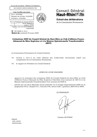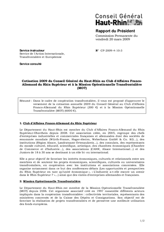 Cotisations 2009 du Conseil Général du Haut-Rhin au Club d'Affaires Franco-Allemand du Rhin Supérieur et à la Mission Opérationnelle Transfrontalière (MOT)