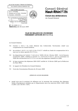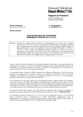 Versement anticipé 2009 du Fonds de Compensation de la Taxe sur la Valeur Ajoutée (F.C.T.V.A.) dû au titre des dépenses d’investissement éligibles réalisées par le Département en 2008, en application du plan de relance de l’Economie : le dispositif est prévu à la loi de finances rectificative 2009 (LFR 2009 / n° 2009 – 122 du 4 février 2009). Les dépenses réelles réalisées en 2009 doivent être supérieures au montant de 156 591 735 €, constaté au périmètre retenu au cours des années 2004-2007. Une convention est passée avec le Préfet pour formaliser les engagements du Département et de l’Etat.