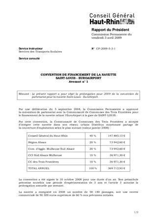 Le présent rapport a pour objet la prolongation pour 2009 de la convention de partenariat pour la navette Saint-Louis - EuroAirport.
