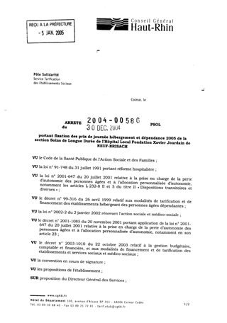 portant fixation des prix de journée hébergement et dépendance 2005 de la section soins de longue durée de l'hôpital local fondation Xavier Jourdain de Neuf-Brisach. Resumé Pièces jointes ARRETE Assemblée : Non défini Date : 30/12/2004 Rapporteur : Non défini Collectivité : Conseil départemental du Haut-Rhin Direction : Non défini Service : Service de la Tarification des Etablissements Domaine : Prix de Journée Commission :