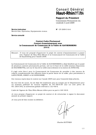 Contrat Cadre Pluriannuel Contrat d'assainissement avec la Communauté de Communes de la Vallée de KAYSERSBERG