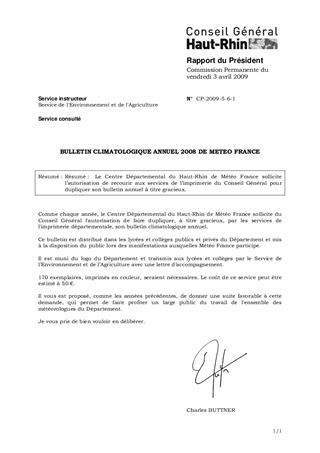 Résumé : Le Centre Départemental du Haut-Rhin de Météo France sollicite l’autorisation de recourir aux services de l’imprimerie du Conseil Général pour dupliquer son bulletin annuel à titre gracieux.