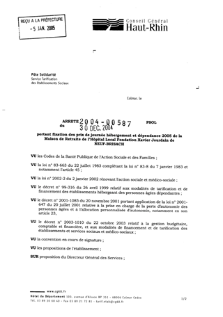 portant fixation des prix de journée hébergement et dépendance 2005 de la maison de retraite de l'hôpital local fondation Xavier Jourdain de Neuf-Brisach. Resumé Pièces jointes ARRETE Assemblée : Non défini Date : 30/12/2004 Rapporteur : Non défini Collectivité : Conseil départemental du Haut-Rhin Direction : Non défini Service : Service de la Tarification des Etablissements Domaine : Prix de Journée Commission :