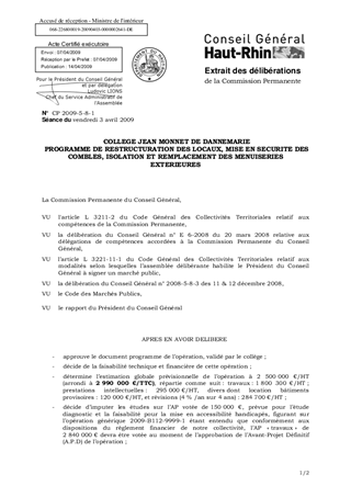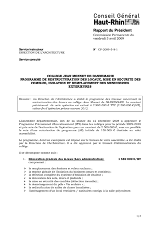 La Direction de l’Architecture a établi le programme des travaux concernant la restructuration des locaux au collège Jean Monnet de Dannemarie. Le montant prévisionnel de cette opération est estimé à 2 990 000 € TTC (2 500 000 €/HT), valeur fin d'opération prévue courant 2012.