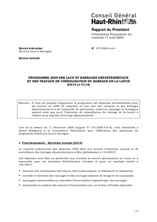 Il vous est proposé d’approuver le programme des dépenses prévisionnelles pour les actions en 2009 de maintien en bon état des retenues et des barrages départementaux et de l'ensemble du patrimoine, construit, paysager et écologique associé ainsi que pour l’opération de consolidation du barrage de la Lauch à réaliser sous maîtrise d’ouvrage départementale