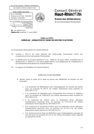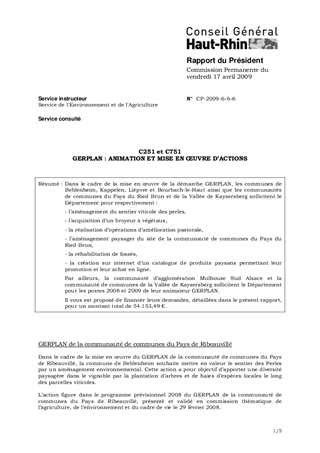 Dans le cadre de la mise en œuvre de la démarche GERPLAN, les communes de Beblenheim, Kappelen, Lièpvre et Bourbach-le-Haut ainsi que les communautés de communes du Pays du Ried Brun et de la Vallée de Kaysersberg sollicitent le Département pour respectivement : - l’aménagement du sentier viticole des perles, - l’acquisition d’un broyeur à végétaux, - la réalisation d’opérations d’amélioration pastorale, - l’aménagement paysager du site de la communauté de communes du Pays du Ried Brun, - la réhabilitation de fossés, - la création sur internet d’un catalogue de produits paysans permettant leur promotion et leur achat en ligne. Par ailleurs, la communauté d’agglomération Mulhouse Sud Alsace et les communautés de communes de la Vallée de Kaysersberg et de la Porte d’Alsace sollicitent le Département pour les postes 2008 et 2009 de leur animateur GERPLAN. Il vous est proposé de financer leurs demandes, détaillées dans le présent rapport, pour un montant total de 72.981,41 €