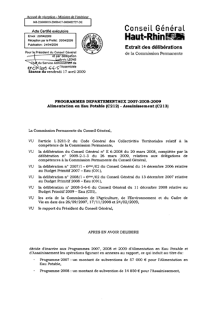 Après examen par la Commission de l'Agriculture, de l'Environnement et du Cadre de Vie, des dossiers présentés en 2007, 2008 et 2009, il vous est proposé de programmer les opérations dont l'ordre de service nous est parvenu, ce qui induit au titre des programmes: - 2007 : un montant de subventions de 57 000 € pour l'Alimentation en Eau Potable, - 2008 : un montant de subvention de 14 850 € pour l'Assainissement, - 2009 : un montant de subvention de 17 880 € pour l'Assainissement.