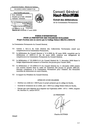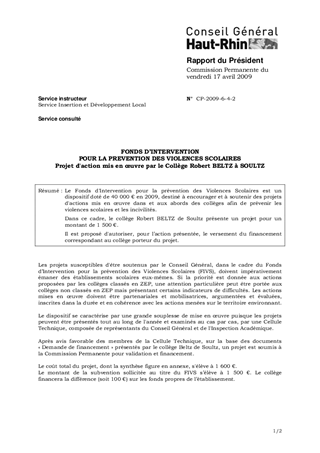 Le Fonds d'Intervention pour la prévention des Violences Scolaires est un dispositif doté de 40 000 € en 2009, destiné à encourager et à soutenir des projets d'actions mis en œuvre dans et aux abords des collèges afin de prévenir les violences scolaires et les incivilités. Dans ce cadre, le collège Robert BELTZ de Soultz présente un projet pour un montant de 1 500 €. Il est proposé d'autoriser, pour l’action présentée, le versement du financement correspondant au collège porteur du projet.