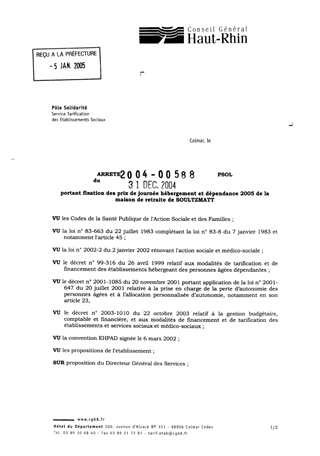 portant fixation des prix de journée hébergement et dépendance 2005 de la maison de retraite de Soultzmatt. Resumé Pièces jointes ARRETE Assemblée : Non défini Date : 31/12/2004 Rapporteur : Non défini Collectivité : Conseil départemental du Haut-Rhin Direction : Non défini Service : Service de la Tarification des Etablissements Domaine : Prix de Journée Commission :