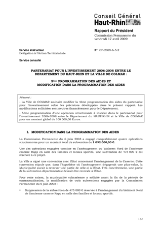 - La Ville de COLMAR souhaite modifier la 4ème programmation des aides du partenariat pour l'investissement selon les précisions développées dans le présent rapport. Les modifications sollicitées sont neutres financièrement pour le Département. - 5ème programmation d'une opération structurante à inscrire dans le partenariat pour l'investissement 2006-2008 entre le Département du HAUT-RHIN et la Ville de COLMAR pour un montant global de 100 000,00 Euros.