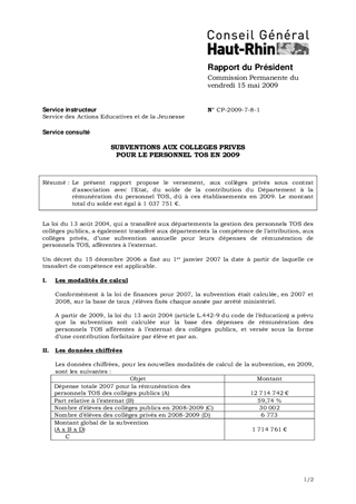 SUBVENTIONS AUX COLLEGES PRIVES POUR LE PERSONNEL TOS EN 2009