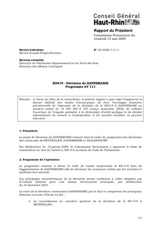 A l'issue du bilan de la concertation, le présent rapport a pour objet d’approuver le dossier définitif des études d’avant-projet, de fixer l’enveloppe financière prévisionnelle de l’opération de la déviation de la RD419 à DANNEMARIE au montant estimé de 18 000 000 € TTC (valeur septembre 2008), de solliciter l’ouverture de l’enquête préalable à la déclaration d’utilité publique et de décider expressément de recourir à l’expropriation si les accords amiables ne peuvent intervenir.
