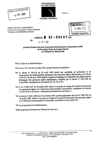 Portant fixation des prix de journée hébergement et dépendance 2002 de la section soins de longue durée de l'hôpital de Ribeauvillé Resumé Pièces jointes ARRETE Assemblée : Non défini Date : 05/02/2002 Rapporteur : Non défini Collectivité : Conseil départemental du Haut-Rhin Direction : Non défini Service : Service de la Tarification des Etablissements Domaine : Prix de Journée Commission :