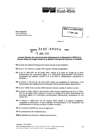 portant fixation des prix de journée hébergement et dépendance 2005 de la section soins de longue durée de la maison d'accueil du Diaconat à Colmar. Resumé Pièces jointes ARRETE Assemblée : Non défini Date : 05/01/2005 Rapporteur : Non défini Collectivité : Conseil départemental du Haut-Rhin Direction : Non défini Service : Service de la Tarification des Etablissements Domaine : Prix de Journée Commission :