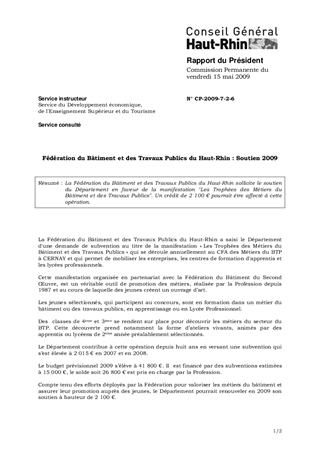La Fédération du Bâtiment et des Travaux Publics du Haut-Rhin sollicite le soutien du Département en faveur de la manifestation "Les Trophées des Métiers du Bâtiment et des Travaux Publics". Un crédit de 2 100 € pourrait être affecté à cette opération.