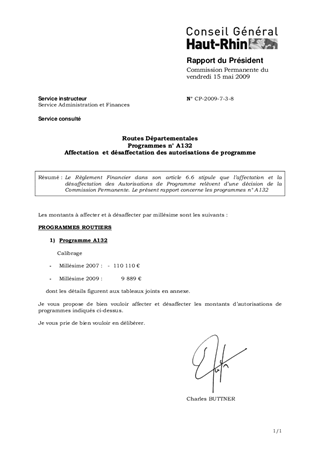 Le Règlement Financier dans son article 6.6 stipule que l’affectation et la désaffectation des Autorisations de Programme relèvent d’une décision de la Commission Permanente. Le présent rapport concerne les programmes n° A132