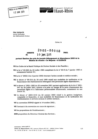 portant fixation des prix de journée hébergement et dépendance 2005 de la maison de retraite "Le Séquoia" à Illzach. Resumé Pièces jointes ARRETE Assemblée : Non défini Date : 10/01/2005 Rapporteur : Non défini Collectivité : Conseil départemental du Haut-Rhin Direction : Non défini Service : Service de la Tarification des Etablissements Domaine : Prix de Journée Commission :