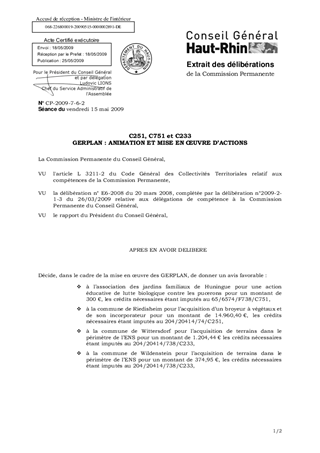 Dans le cadre de la mise en œuvre de la démarche GERPLAN, l’association des jardins familiaux de Huningue et les communes de Riedisheim, Wittersdorf et Wildenstein sollicitent le Département pour respectivement : - une opération d’action éducative de lutte biologique contre les pucerons, - l’acquisition d’un broyeur à végétaux avec grappin de chargement, - l’acquisition de 14 parcelles dans le cadre d’un Espace Naturel Sensible. - l’acquisition de 3 parcelles dans le cadre d’un Espace Naturel Sensible. Par ailleurs, la communauté de communes du Pays de Thann sollicite le Département pour le poste 2009 de son animateur GERPLAN. Il vous est proposé de financer leurs demandes, détaillées dans le présent rapport, pour un montant total de 25.351,79 €.