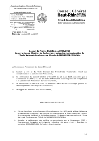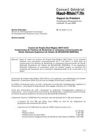 Dans le cadre du Contrat de Projets Etat/Région 2007/2013, il est proposé d'allouer une subvention d'investissement de 4 133 000 € à l'Etat pour la construction d'un Institut de Recherche et l'extension/restructuration de l'Ecole Nationale Supérieure de Chimie de MULHOUSE (ENSCMu). Il est également demandé d'appouver la convention jointe au présent rapport et précisant les modalités de versement de la subvention départementale et de m'autoriser à la signer.