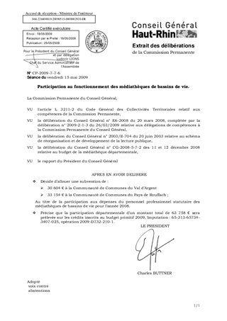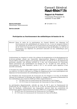 Dans le cadre de la participation du Conseil Général aux dépenses de fonctionnement des médiathèques de bassins de vie, il vous est proposé d’allouer une subvention de 30 604 € à la Communauté de Communes du Val d’Argent et de 33 154 € à la Communauté de Communes du Pays de Rouffach, au titre de la participation aux dépenses du personnel statutaire de leur médiathèque pour l’année 2008.