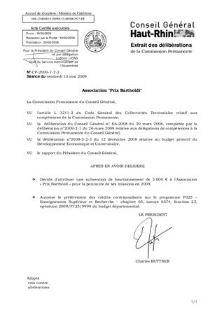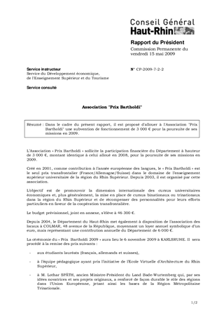 Dans le cadre du présent rapport, il est proposé d'allouer à l'Association "Prix Bartholdi" une subvention de fonctionnement de 3 000 € pour la poursuite de ses missions en 2009.
