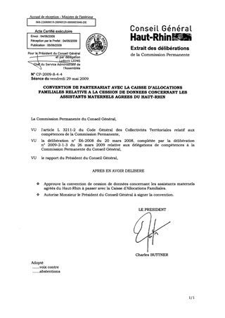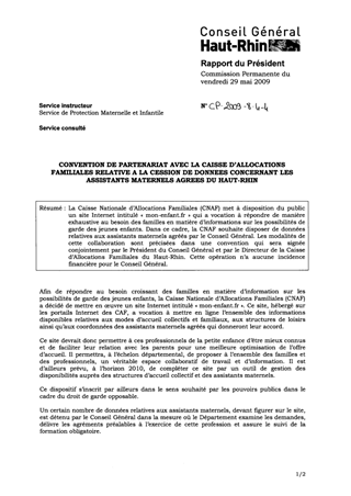 CONVENTION DE PARTENARIAT AVEC LA CAISSE D'ALLOCATIONS FAMILIALES RELATIVE A LA CESSION DE DONNEES CONCERNANT LES ASSISTANTS MATERNELS AGREES DU HAUT-RHIN Resumé Pièces jointes DELIBERATION RAPPORT Assemblée : Commission Permanente Date : 29/05/2009 Rapporteur : Non défini Collectivité : Conseil départemental du Haut-Rhin Direction : Non défini Service : Service de Protection Maternelle et Infantile Domaine : Social / Solidarité Commission : Commission Permanente