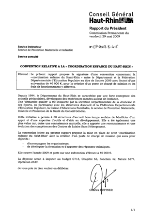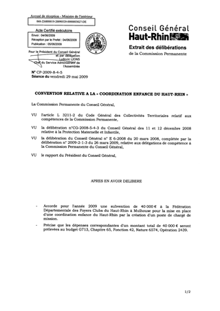 CONVENTION RELATIVE A LA "COORDINATION ENFANCE DU HAUT-RHIN" Resumé Pièces jointes DELIBERATION RAPPORT Assemblée : Commission Permanente Date : 29/05/2009 Rapporteur : Non défini Collectivité : Conseil départemental du Haut-Rhin Direction : Non défini Service : Service de Protection Maternelle et Infantile Domaine : Social / Solidarité Commission : Commission Permanente