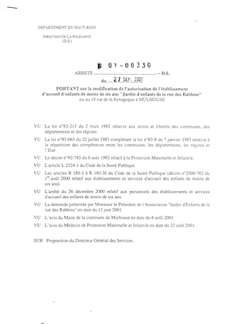 Portant sur la modification de l'autorisation de l'établissement d'accueil d'enfants de moins de six ans Jardin d'enfants de la rue des Rabbins sis au 19 rue de la Synagogue à Mulhouse Resumé Pièces jointes ARRETE Assemblée : Non défini Date : 27/09/2001 Rapporteur : Non défini Collectivité : Conseil départemental du Haut-Rhin Direction : Non défini Service : Service de Protection Maternelle et Infantile Domaine : Accueil d'enfants Commission :