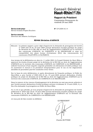 Le présent rapport a pour objet d’approuver la demande de prorogation de l’arrêté n° 2004-232-18 du 19 août 2004 portant déclaration d’utilité publique du projet de déviation de la RD 466 au droit de l’agglomération d’ASPACH sur le territoire des communes d’ASPACH, de CARSPACH et de HEIDWILLER et mise en compatibilité des plans locaux d’urbanisme (PLU) des communautés de communes d’ILLFURTH et d’ALTKIRCH.