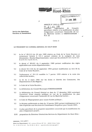 portant organisation de l'enquête parcellaire relative à la modification du plan d'alignement concernant l'immeuble 20, rue du Maréchal Leclerc à Obersaasheim - RD 22. Resumé Pièces jointes ARRETE Assemblée : Non défini Date : 21/01/2005 Rapporteur : Non défini Collectivité : Conseil départemental du Haut-Rhin Direction : Non défini Service : Service du Patrimoine et du droit des Sols Domaine : Autres (non classés) Commission :