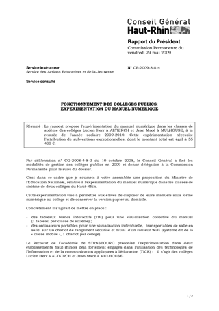 Le rapport propose l'expérimentation du manuel numérique dans les classes de sixième des collèges Lucien Herr à ALTKIRCH et Jean Macé à MULHOUSE, à la rentrée de l'année scolaire 2009-2010. Cette expérimentation nécessite l'attribution de subventions exceptionnelles, dont le montant total est égal à 55 400 €.