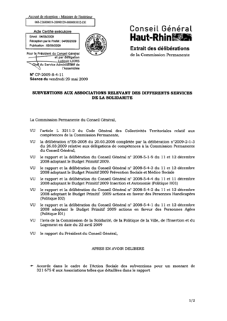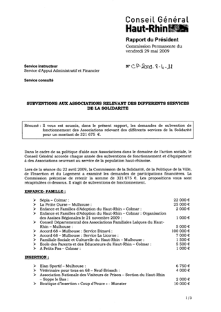 SUBVENTIONS AUX ASSOCIATIONS RELEVANT DES DIFFERENTS SERVICES DE LA SOLIDARITE Resumé Pièces jointes DELIBERATION RAPPORT Assemblée : Commission Permanente Date : 29/05/2009 Rapporteur : Non défini Collectivité : Conseil départemental du Haut-Rhin Direction : Non défini Service : Direction Générale Adjointe de la Solidarité, Culture, Patrimoine, Education, Sport et Jeunesse Domaine : Social / Solidarité Commission : Commission Permanente