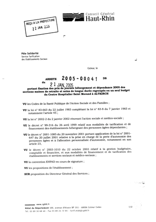 portant fixation des prix de journée hébergement et dépendance 2005 des sections maison de retraite et soins de longue durée regroupés en un seul budget du centre hospitalier Saint Morand à ALTKIRCH. Resumé Pièces jointes ARRETE Assemblée : Non défini Date : 21/01/2005 Rapporteur : Non défini Collectivité : Conseil départemental du Haut-Rhin Direction : Non défini Service : Service de la Tarification des Etablissements Domaine : Prix de Journée Commission :