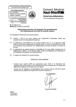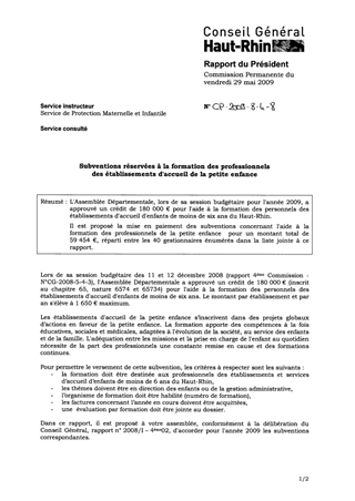 SUBVENTIONS RESERVEES A LA FORMATION DES PROFESSIONNELS DES ETABLISSEMENTS D'ACCUEIL DE LA PETITE ENFANCE Resumé Pièces jointes DELIBERATION RAPPORT Assemblée : Commission Permanente Date : 29/05/2009 Rapporteur : Non défini Collectivité : Conseil départemental du Haut-Rhin Direction : Non défini Service : Service de Protection Maternelle et Infantile Domaine : Social / Solidarité Commission : Commission Permanente