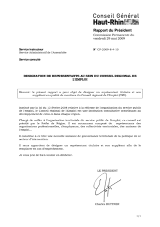 le présent rapport a pour objet de désigner un représentant titulaire et son suppléant en qualité de membres du Conseil régional de l'Emploi (CRE).