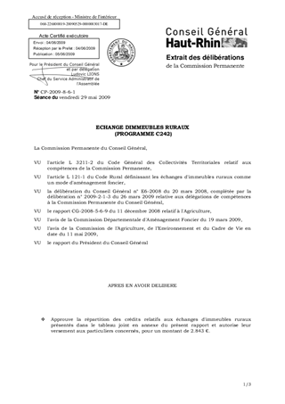L'article L 121-1 du Code Rural définit les échanges d'immeubles ruraux comme un mode d'aménagement foncier. Le financement des échanges est assuré par le Département (frais de notaire et de géomètre) et prévu dans le cadre des autorisations de programme 2009. La participation départementale est versée aux particuliers ou aux communes après avis favorable de la Commission Départementale d'Aménagement Foncier (CDAF). Le tableau joint en annexe présente 7 dossiers ayant recueillis l'avis favorable de la CDAF du 19 mars 2009 et de la Commission de l'Agriculture, de l'Environnement et du Cadre de Vie du 11 mai 2009. L'aide à débloquer s'élève à 2.843 €.