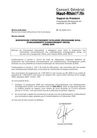 La Commission Permanente a délégation pour voter le programme des subventions d'investissement aux établissements d’enseignement privés. Le montant de ce programme s'élève, pour l'année 2009, à 652 292 €.