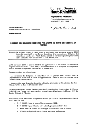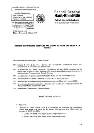 GESTION DES CREDITS DELEGUES PAR L’ETAT AU TITRE DES AIDES A LA PIERRE Resumé Pièces jointes DELIBERATION RAPPORT Assemblée : Commission Permanente Date : 12/06/2009 Rapporteur : Non défini Collectivité : Conseil départemental du Haut-Rhin Direction : Non défini Service : Service Habitat et Solidarités Territoriales Domaine : Habitat Commission : Commission Permanente