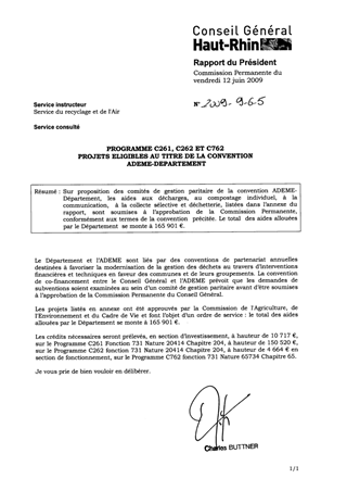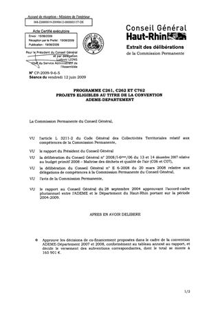 PROGRAMME C261, C262 ET C762 PROJETS ELIGIBLES AU TITRE DE LA CONVENTION ADEME-DEPARTEMENT Resumé Pièces jointes DELIBERATION RAPPORT Assemblée : Commission Permanente Date : 12/06/2009 Rapporteur : Non défini Collectivité : Conseil départemental du Haut-Rhin Direction : Non défini Service : Service Energie et Recyclage Domaine : Aides / Subventions Commission : Commission Permanente