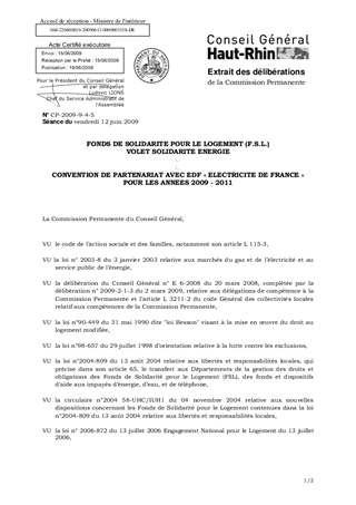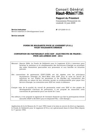 FONDS DE SOLIDARITE POUR LE LOGEMENT (F.S.L.) VOLET SOLIDARITE ENERGIE CONVENTION DE PARTENARIAT AVEC EDF « ELECTRICITE DE FRANCE » POUR LES ANNEES 2009 - 2011