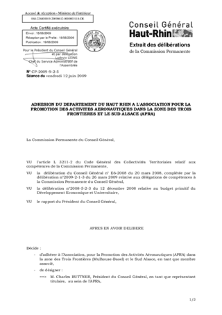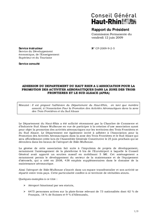 ADHESION DU DEPARTEMENT DU HAUT RHIN A L'ASSOCIATION POUR LA PROMOTION DES ACTIVITES AERONAUTIQUES DANS LA ZONE DES TROIS FRONTIERES ET LE SUD ALSACE (APRA)