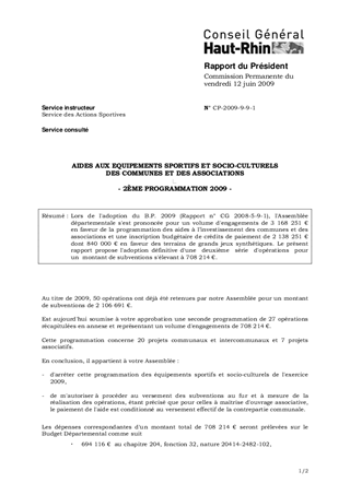 Lors de l'adoption du B.P. 2009 (Rapport n° CG 2008-5-9-1), l'Assemblée départementale s'est prononcée pour un volume d'engagements de 3 168 251 € en faveur de la programmation des aides à l’investissement des communes et des associations et une inscription budgétaire de crédits de paiement de 2 138 251 € dont 840 000 € en faveur des terrains de grands jeux synthétiques. Le présent rapport propose l'adoption définitive d'une deuxième série d'opérations pour un montant de subventions s'élevant à 708 214 €.