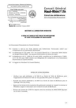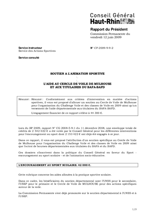 Résumé : Conformément aux critères d'intervention en matière d'actions sportives, il vous est proposé d'allouer un soutien au Cercle de Voile de Mulhouse pour l'organisation du Challenge Voile et des classes de Voile en 2009 ainsi qu'un versement de l'aide départementale aux titulaires du BAFA-BAFD. L'engagement financier de ce rapport s'élève à 44 300 €.