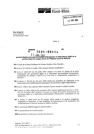 portant fixation des prix de journée hébergement et dépendance 2005 de la section soins de longue durée de l'hôpital local de SOULTZ. Resumé Pièces jointes ARRETE Assemblée : Non défini Date : 21/01/2005 Rapporteur : Non défini Collectivité : Conseil départemental du Haut-Rhin Direction : Non défini Service : Service de la Tarification des Etablissements Domaine : Prix de Journée Commission :