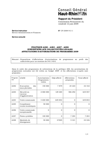 POLITIQUE A282 - A283 - A287 - A288 SUBVENTIONS AUX COLLECTIVITÉS LOCALES AFFECTATIONS D'AUTORISATIONS DE PROGRAMME 2009