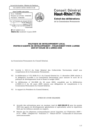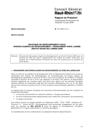 POLITIQUE DE DEVELOPPEMENT LOCAL POSTES D'AGENTS DE DEVELOPPEMENT : FINANCEMENT POUR L'ANNEE 2009 ET SOLDE DE L'ANNEE 2008